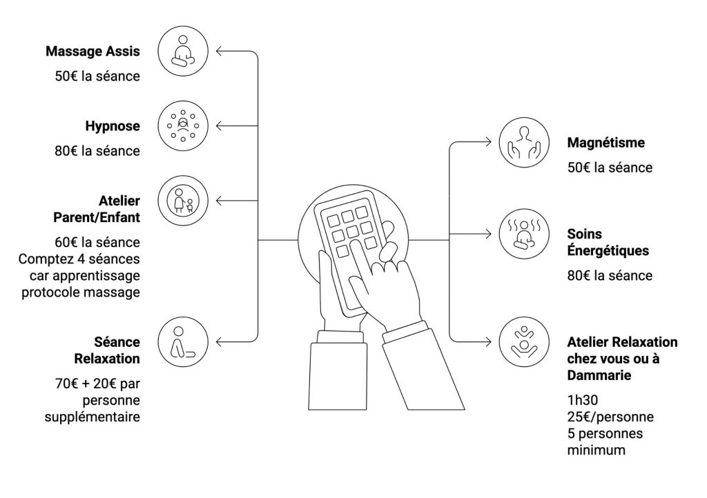 Offrez-vous un moment de détente et de reconnexion grâce à mes services spécialisés en massage assis Amma, relaxation, soins énergétiques et hypnose. Chaque séance est conçue pour vous apporter équilibre et sérénité, en fonction de vos besoins spécifiques.